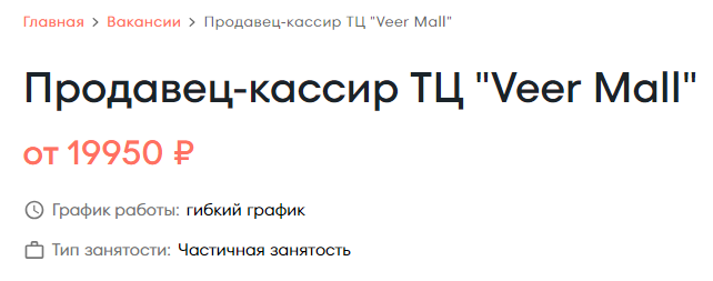 - Продавцу-кассиру в Veer Mall с графиком 2/2 и шестичасовым рабочим днем обещают оплату от 20 тысяч рублей.