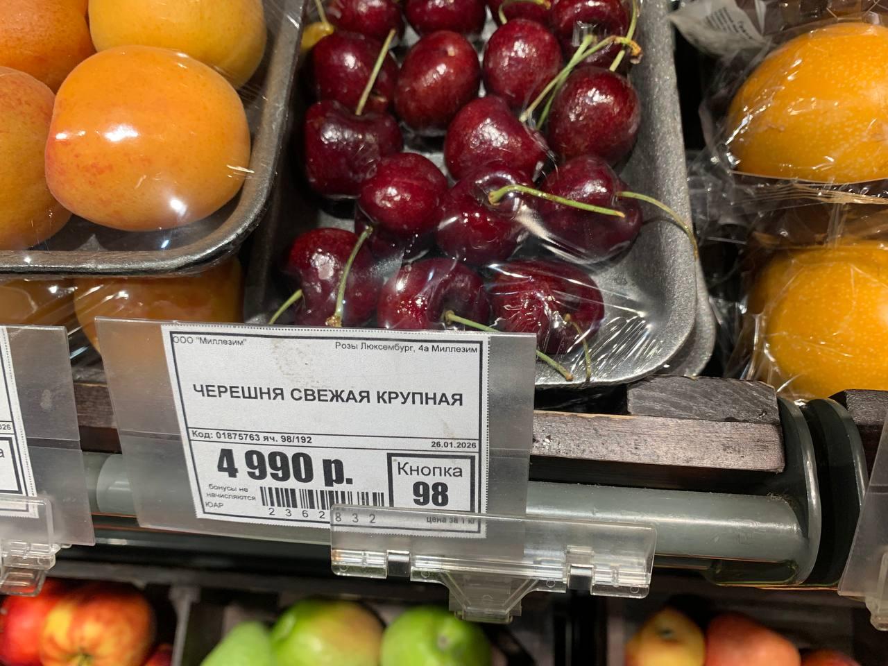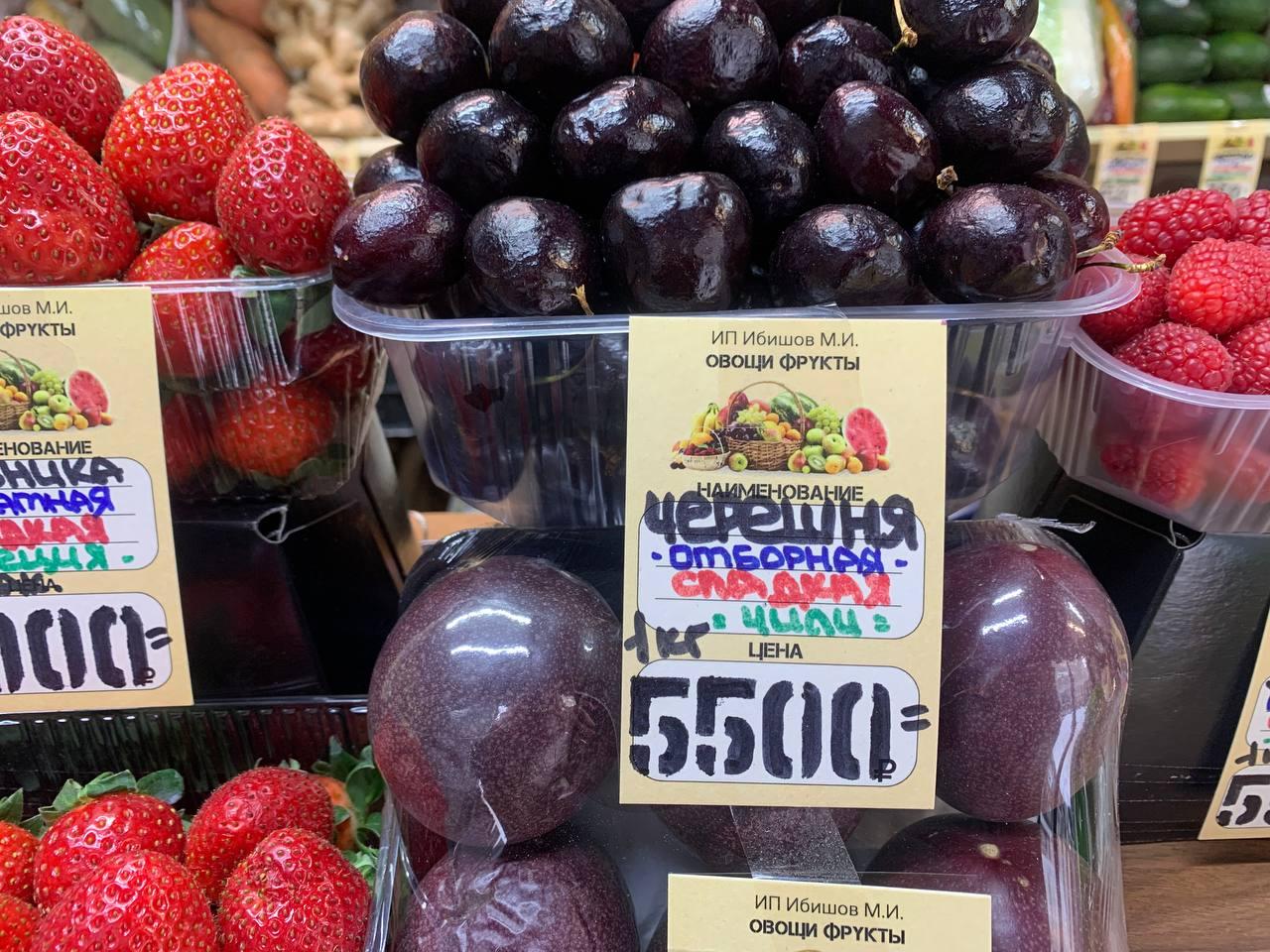 В торговом центре «Гранат» килограмм черешни обойдётся в 5000 рублей. Продавцы отмечают, что это качественная ягода из Чили. В центре города, в киоске у торгового дома «Тихвинъ», цена ещё выше — 5500 рублей за кило.