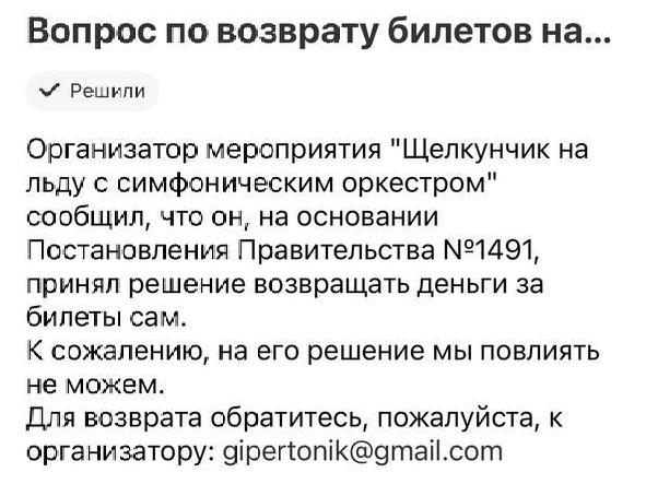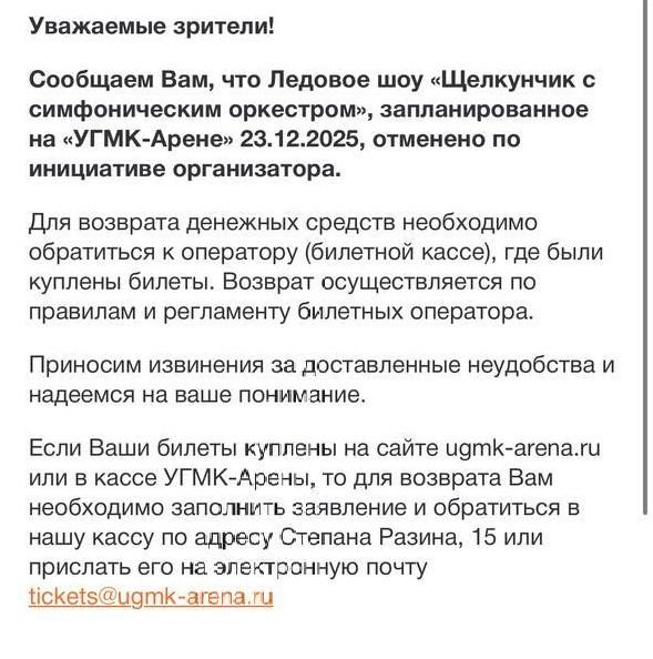 Зрители из Екатеринбурга и других городов России остаются без возможности вернуть деньги за билеты на отмененное шоу «Щелкунчик на льду с симфоническим оркестром». Мероприятие было запланировано на 23 декабря в ледовом дворце «УГМК Арена».
