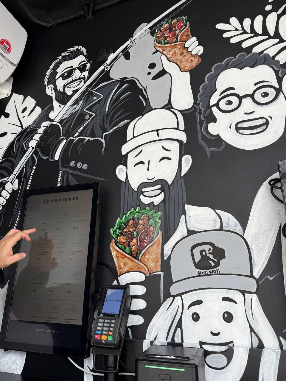 Упаковку для шаурмы оформили под ковёр. Кассиров в киоске нет — заказ оформляется на терминале самообслуживания.
