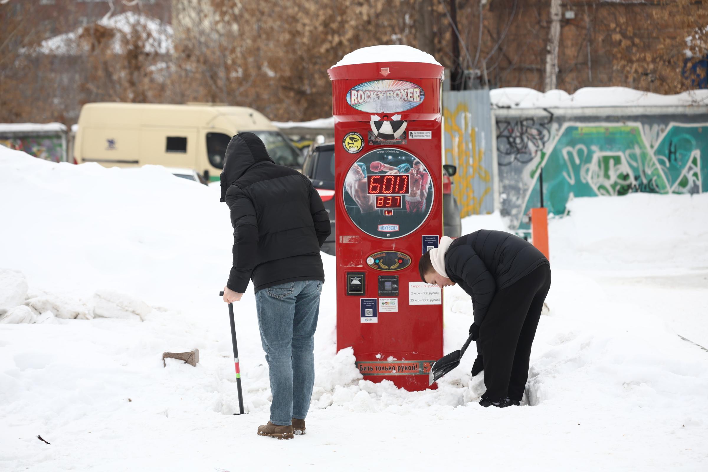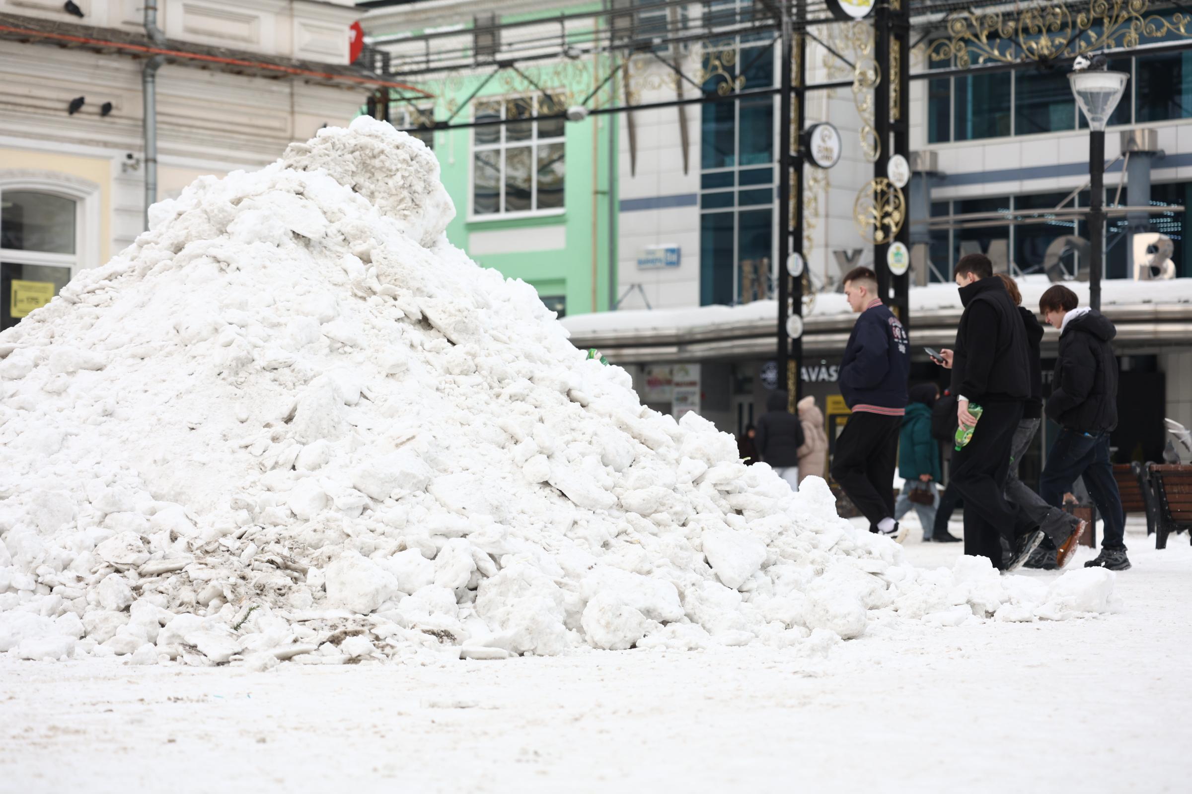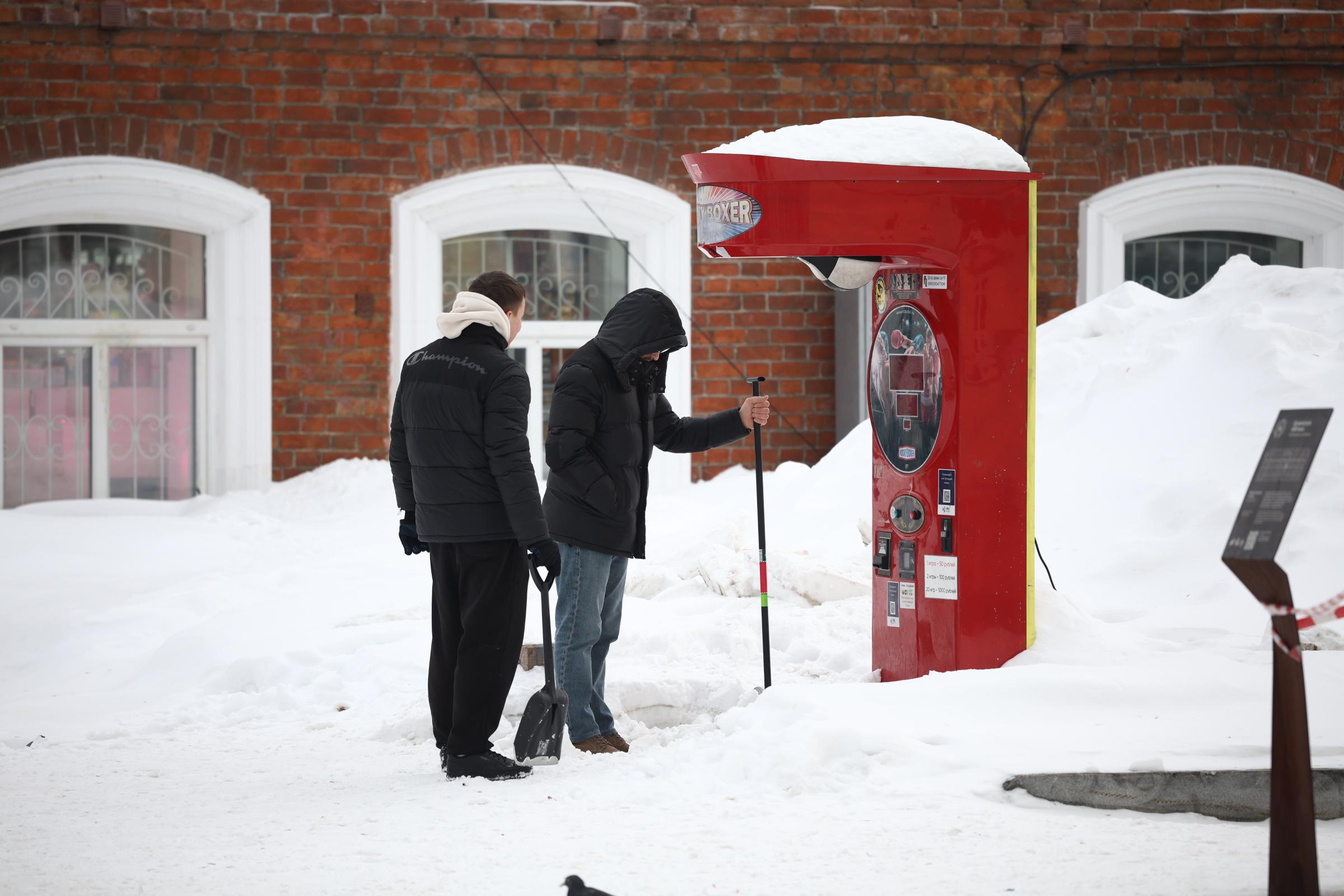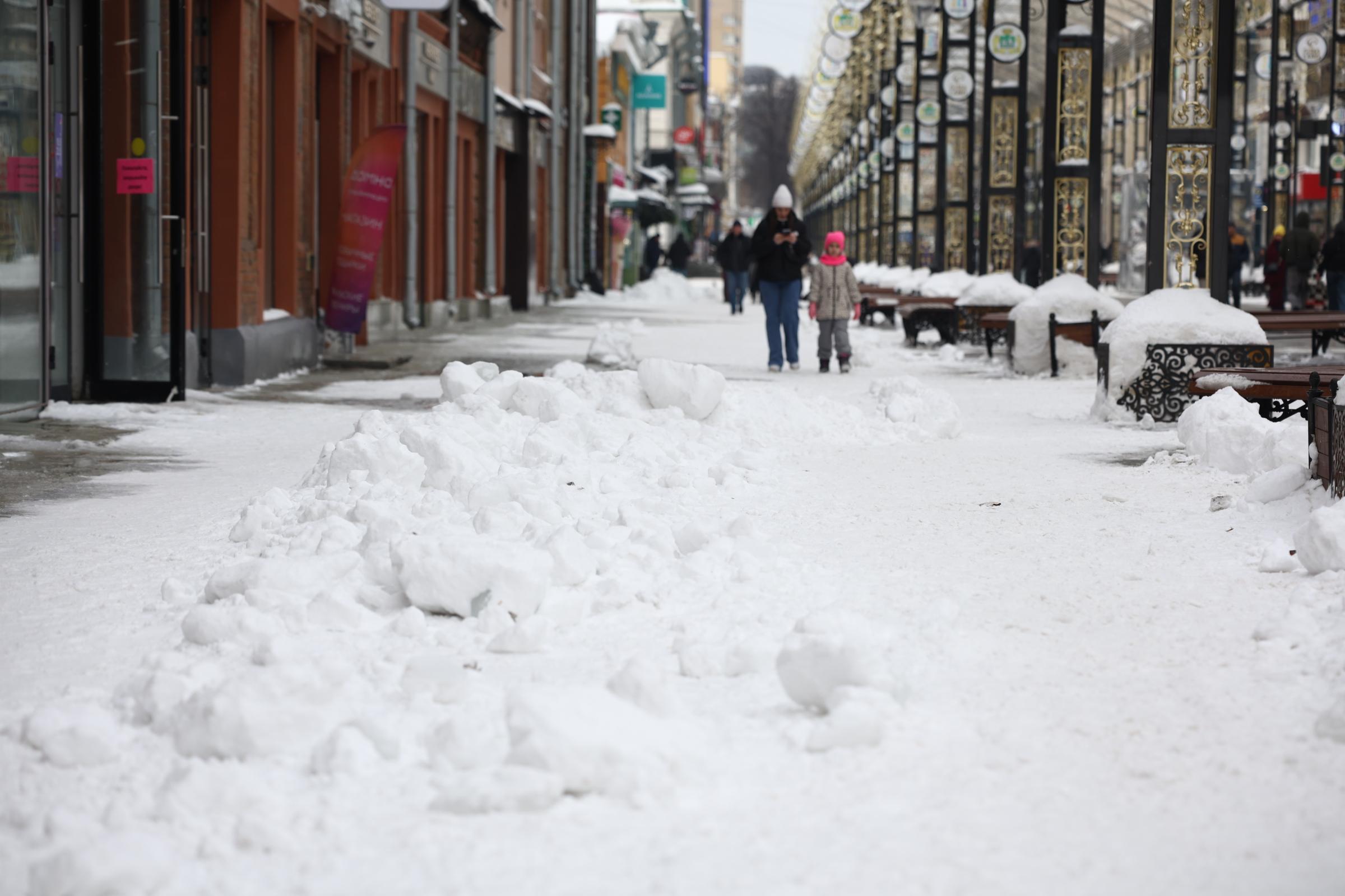 На популярной пешеходной улице Вайнера до сих пор лежат сугробы, из-за чего работникам приходится раскапывать аттракционы. Уборка снега в этом районе идёт неспешно.