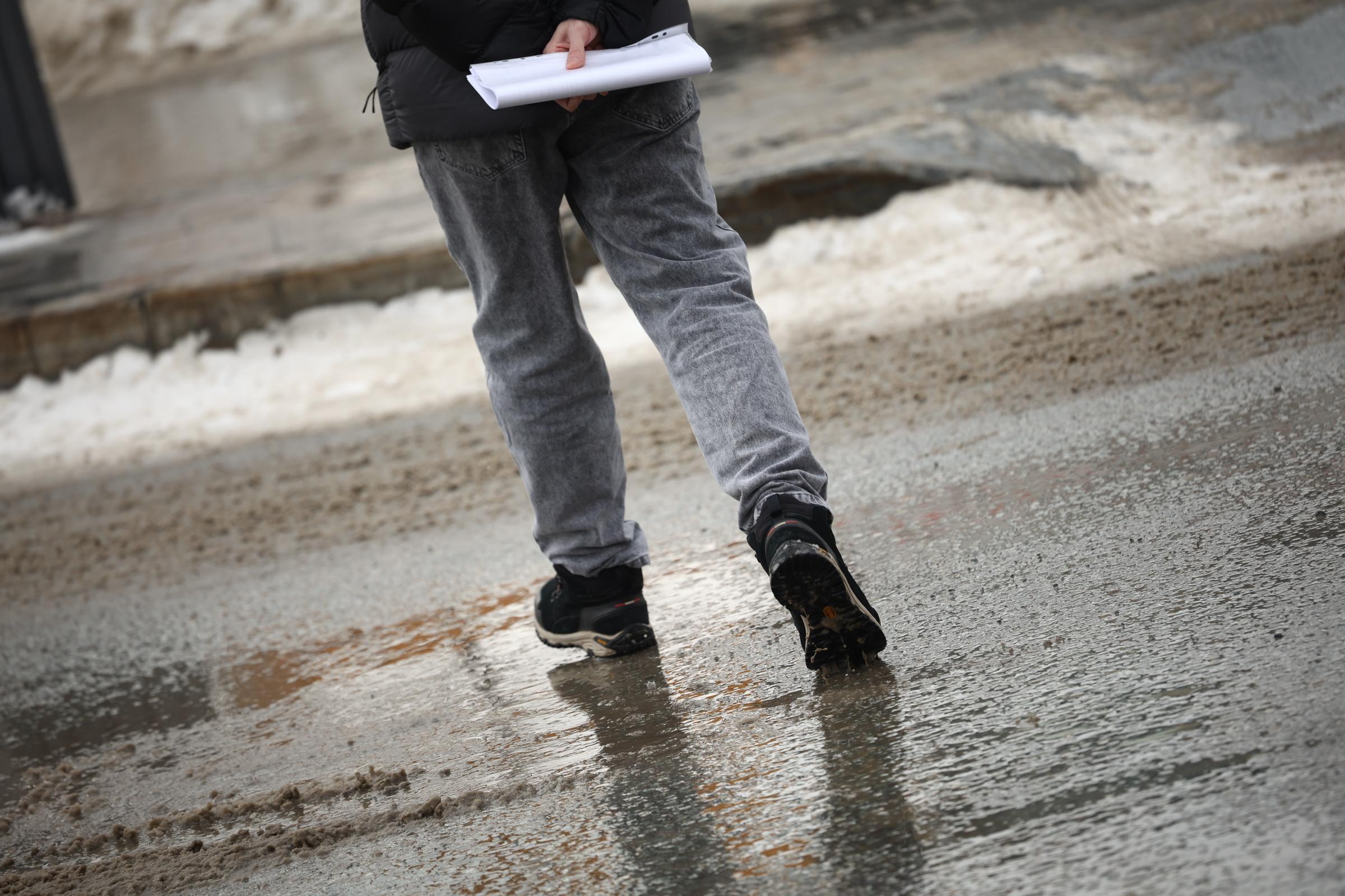 В Екатеринбурге резкое потепление привело к характерной для марта грязной и слякотной погоде. Центральные улицы заполонили потоки темно-коричневой воды, а от недавнего снежного покрова остались лишь отдельные грязные кучи.