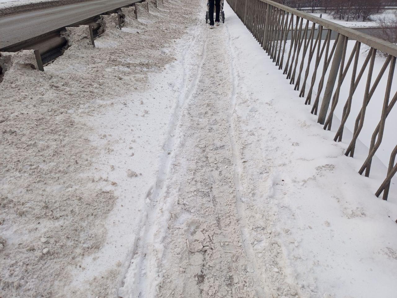 Читатели также сообщили, что пешеходная часть Малышевского моста оказалась завалена снегом.