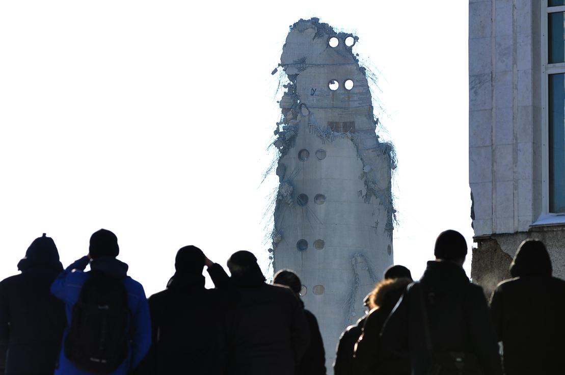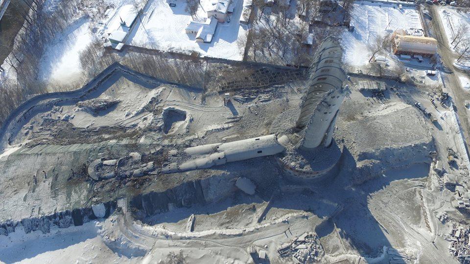 Перед детонацией прозвучала сирена, а через 30 секунд 231-метровая бетонная колонна рухнула. На её месте остался лишь фрагмент, который впоследствии разобрали с применением специальной техники.