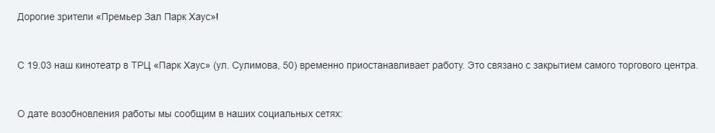 Подтвержденной оказалась информация о закрытии кинотеатра: его работа прекращается уже 19 марта. Все билеты на ближайшие сеансы сняты с продажи.