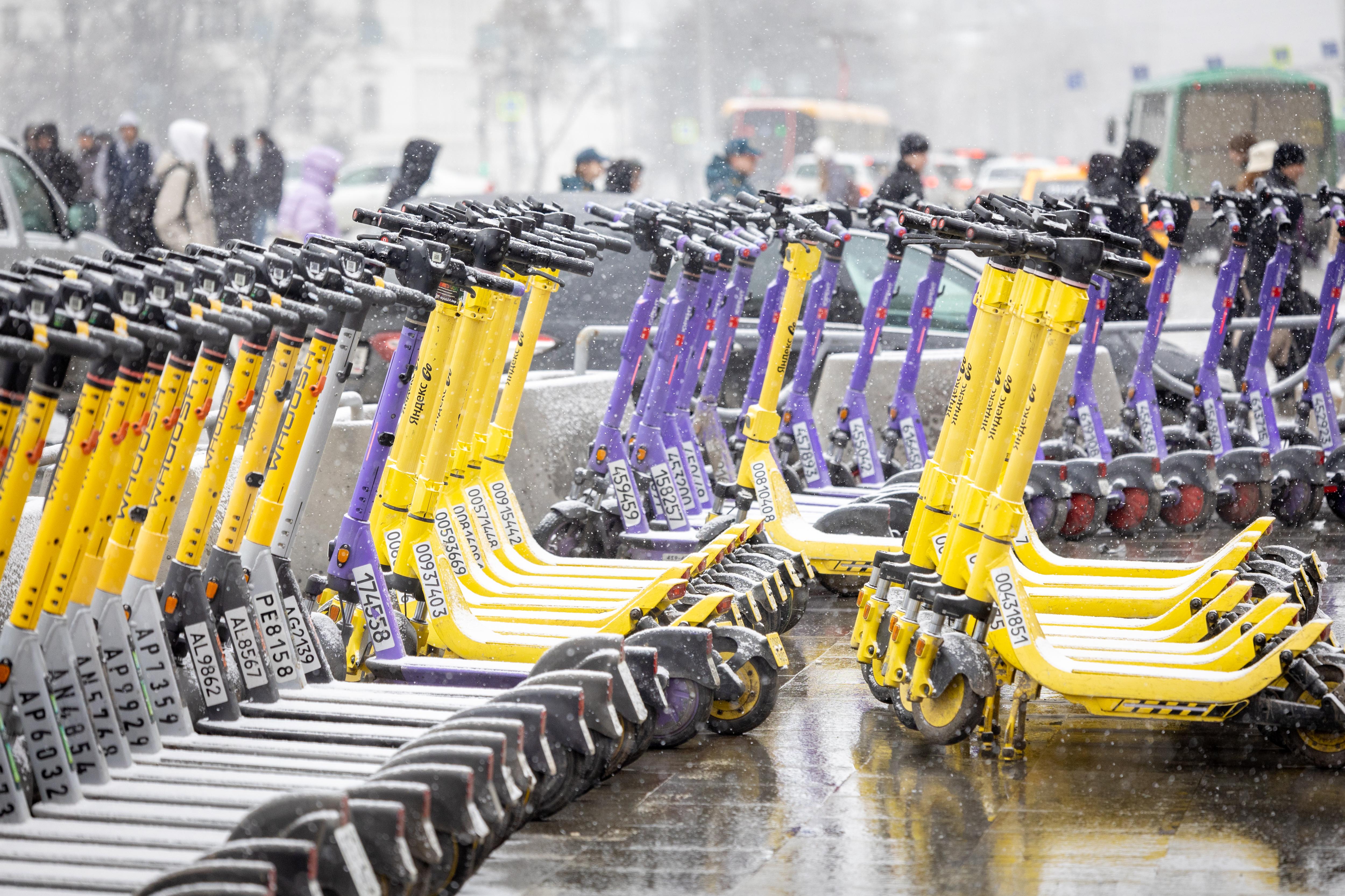 Самокаты оказались не у дел — в такую погоду на них никто не рискует передвигаться.