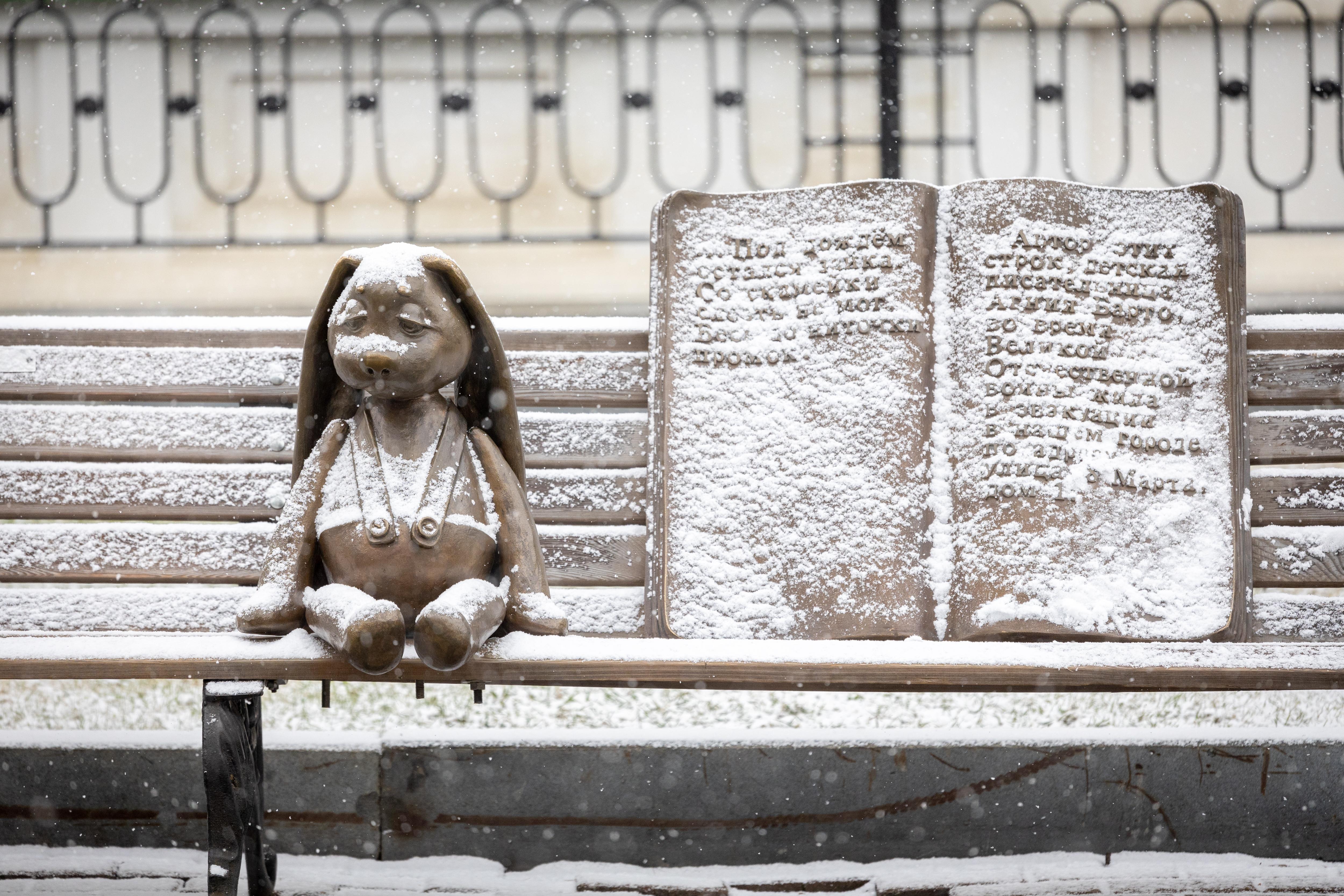 Декоративная фигура зайца продолжает оставаться на заснеженной скамейке.