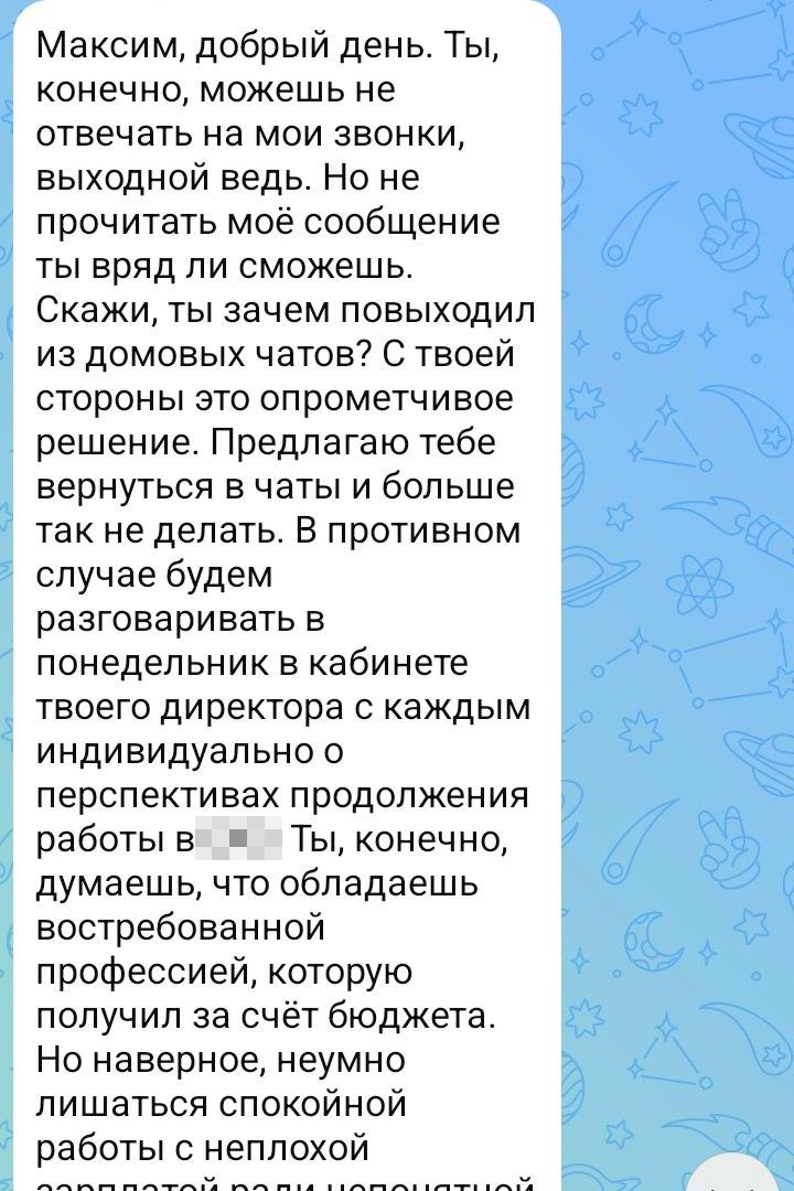 После выхода Максима из групп с ним связался заместитель главы города Тавда Константин Баранов. В личных сообщениях он потребовал вернуться в чаты, пригрозив последствиями.