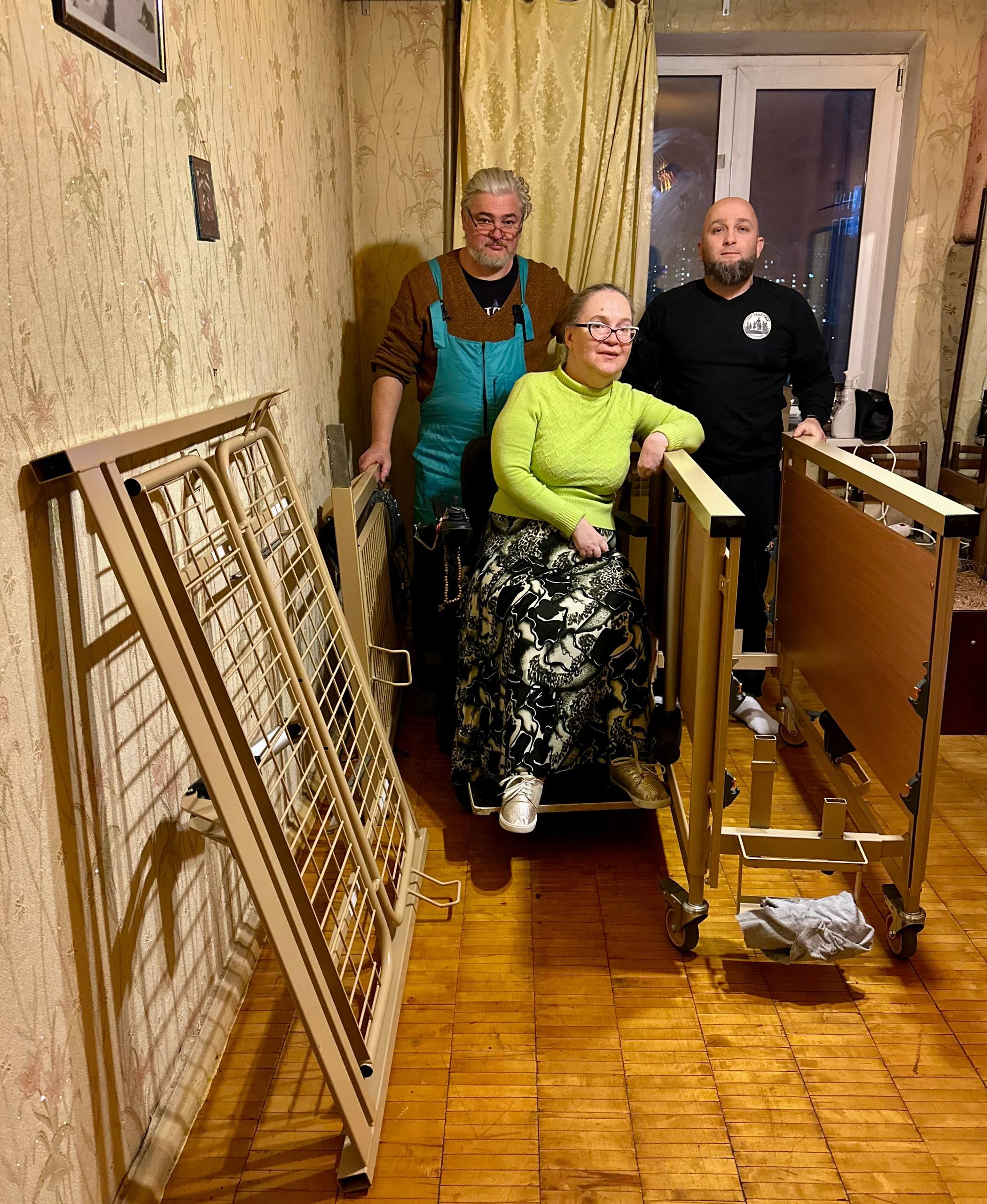 На фотографии Елена Топорова с общественником Сергеем Шунеевым (справа) и бывшим одноклассником Игорем. Они помогли доставить кровать до квартиры. В детстве Елена училась дома, но классный руководитель познакомила с ней одноклассников, которые стали часто навещать девочку. Со многими из них женщина сохранила дружбу.