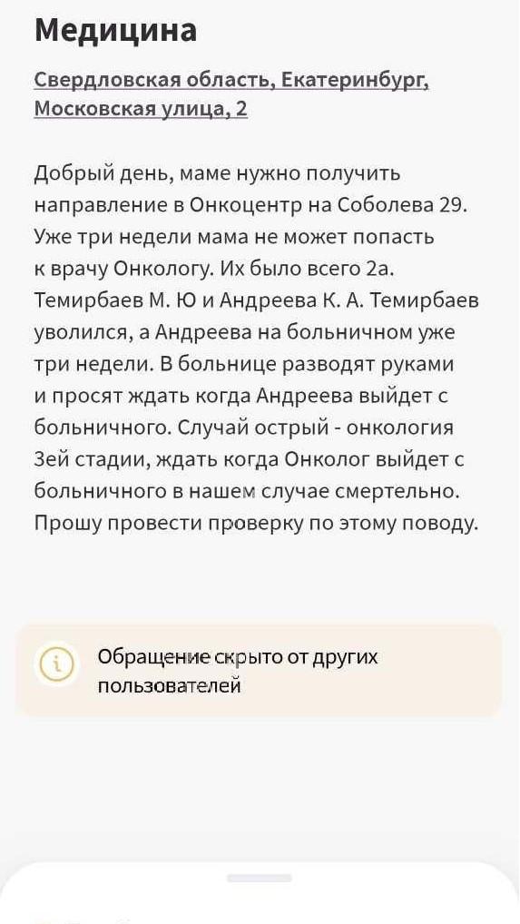 Жительница Екатеринбурга направила официальное обращение в медицинское учреждение.