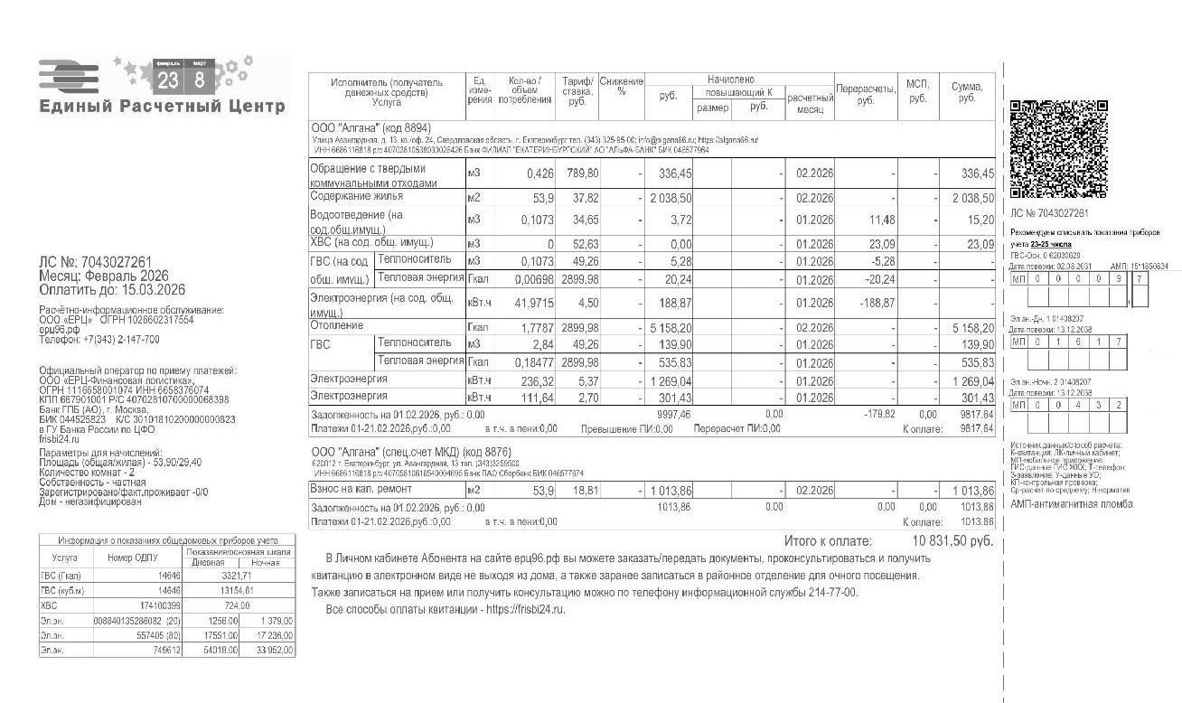 Квитанция от управляющей компании «Алгана» на сумму 10 831 рубль.