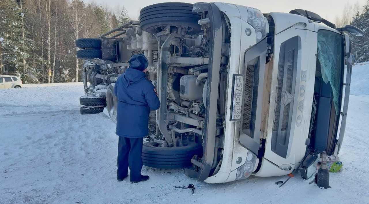 Водитель грузовика не справился с управлением на гололеде, что привело к серьезной аварии.