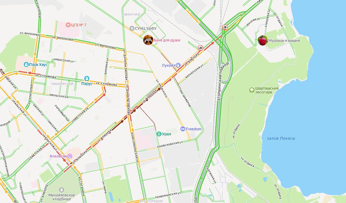- «На Блюхеровском мосту собрался „паровозик“, пробка в направлении Берёзовского», — поделился один из очевидцев.