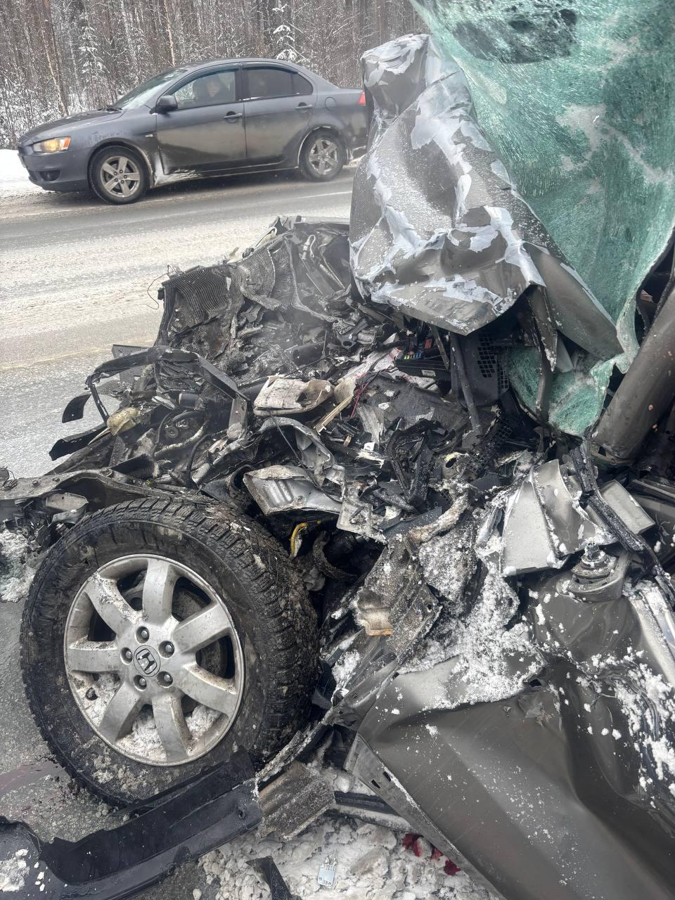 В результате столкновения трех автомобилей на Екатеринбургской кольцевой автодороге погибла женщина за рулем Honda CR-V. Движение на участке затруднено.