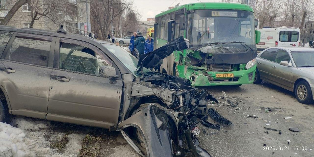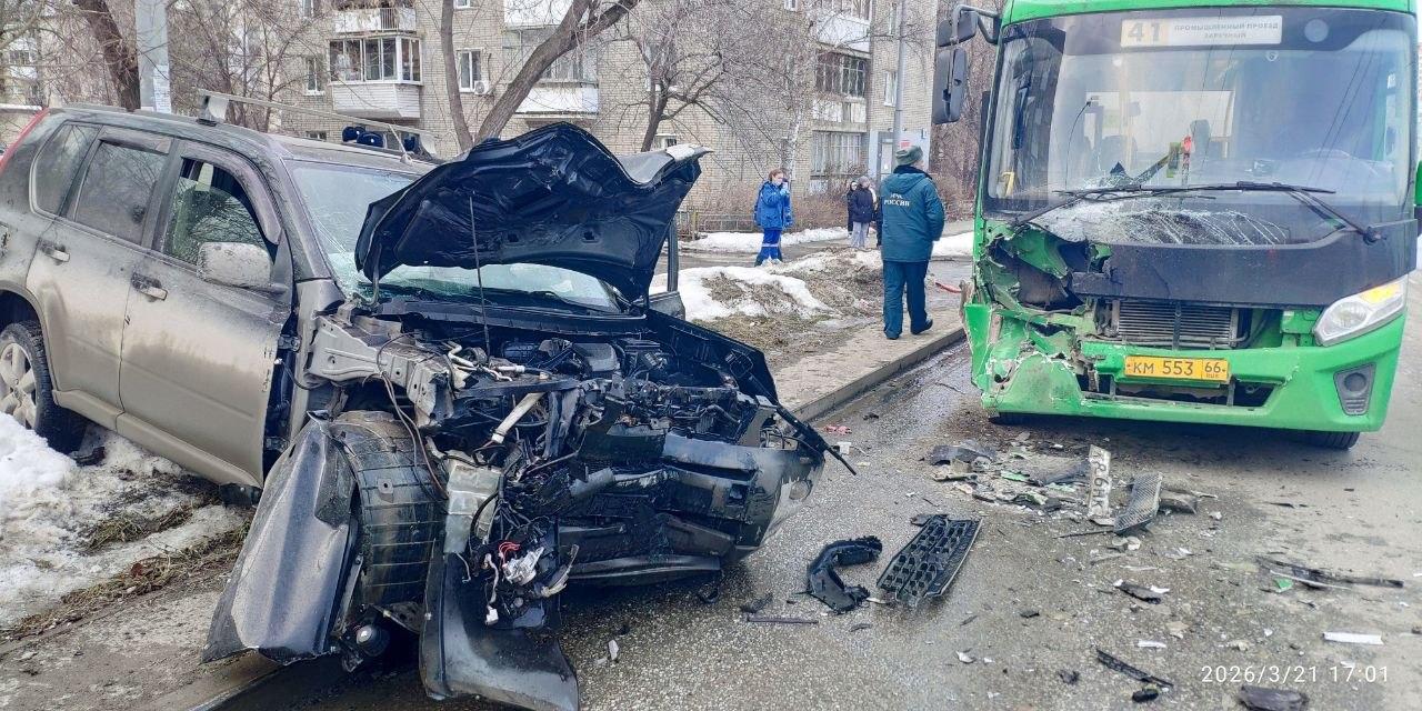 На Эльмаше автобус столкнулся с легковушкой, иномарка загорелась