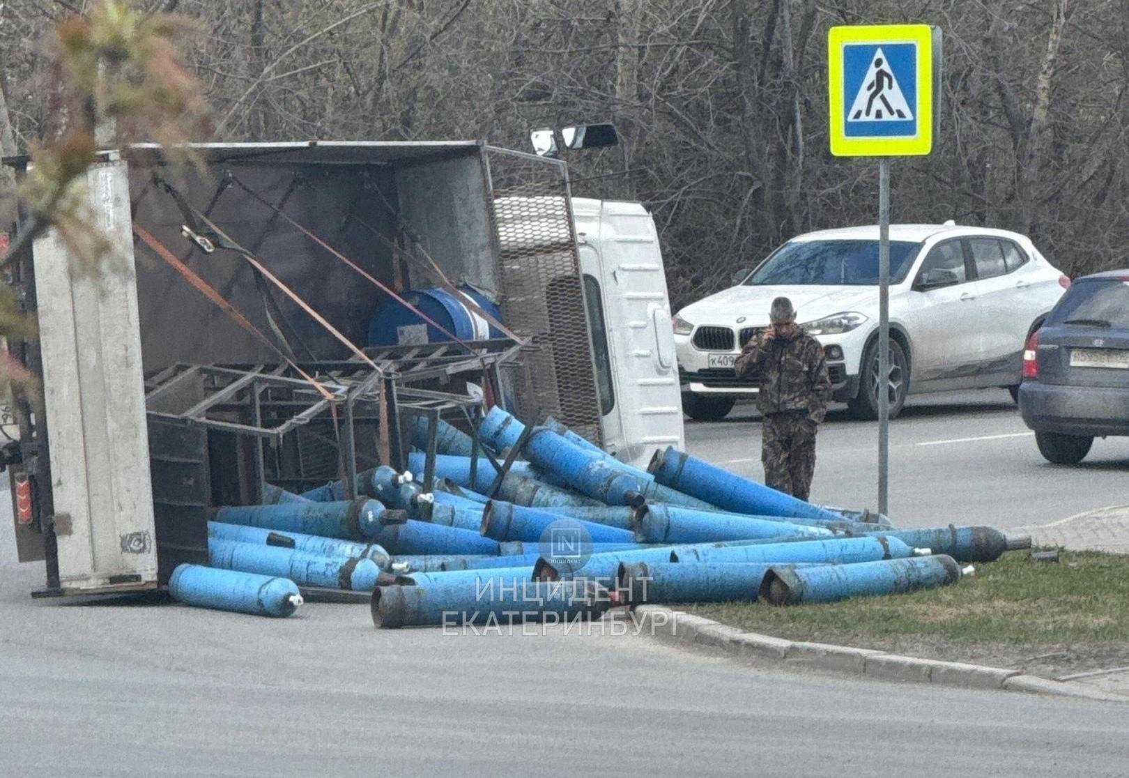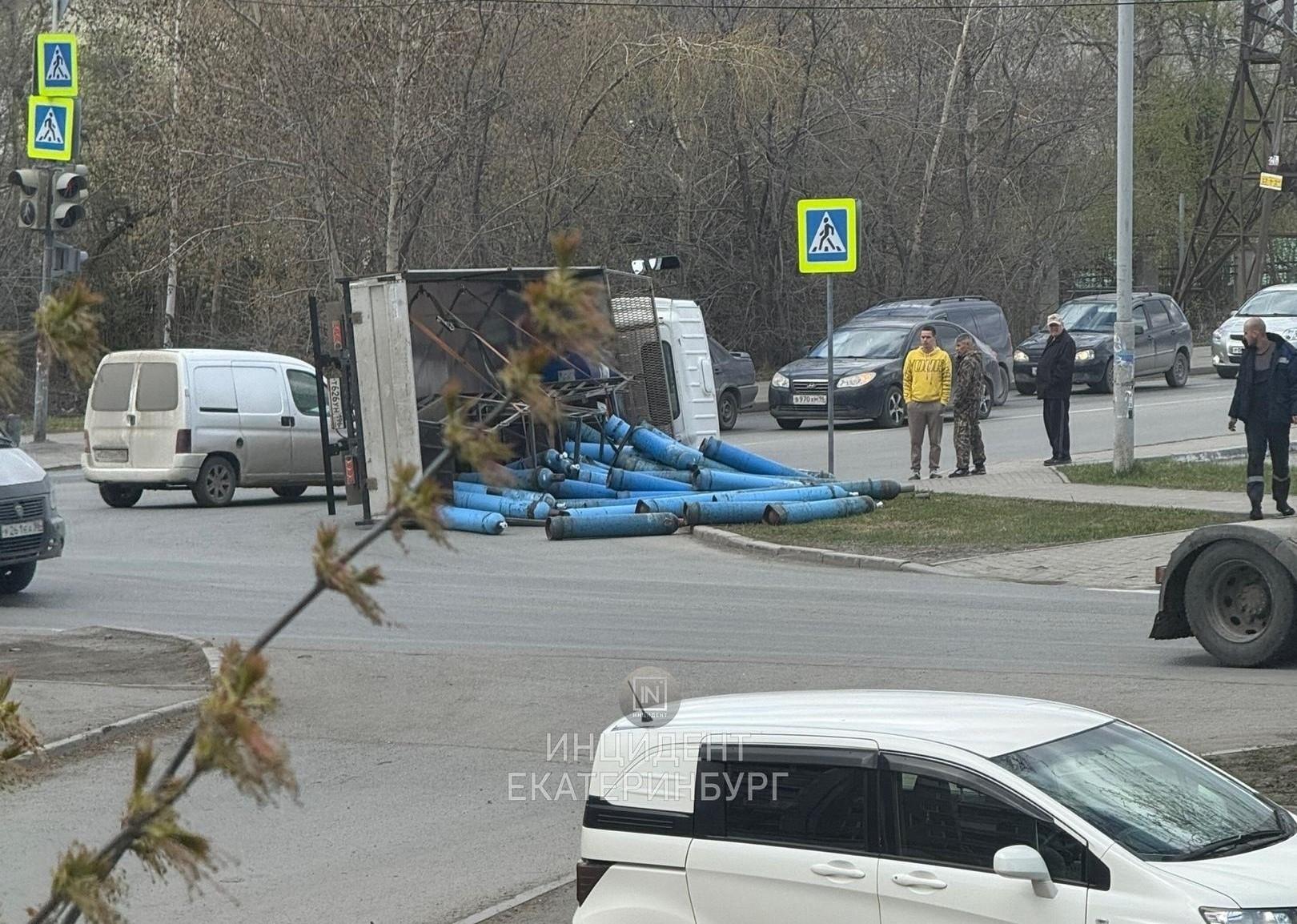 На перекрестке улиц Походной и Южного проезда в микрорайоне Уктус опрокинулся грузовик с газовыми баллонами. По цвету емкостей можно предположить, что они кислородные. Автомобиль завалился на правый бок, баллоны выкатились из кузова на проезжую часть и газон. Информации о пострадавших не поступало. Подробности уточняются в ГИБДД Екатеринбурга.