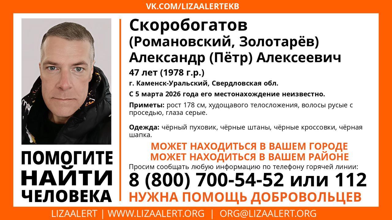 47-летний Александр Скоробогатов исчез по пути из Каменска-Уральского в Екатеринбург. Он может представляться под разными именами.