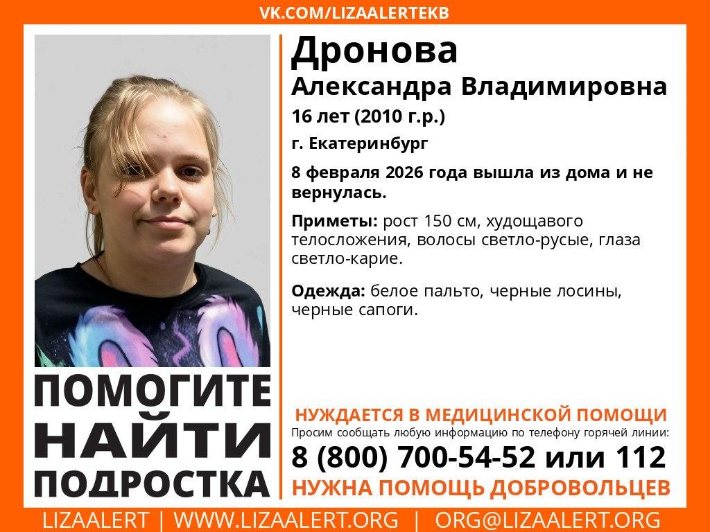 В Екатеринбурге объявлены поиски 16-летней Александры Дроновой. Девочка покинула жилище в ночные часы, пока домашние спали.