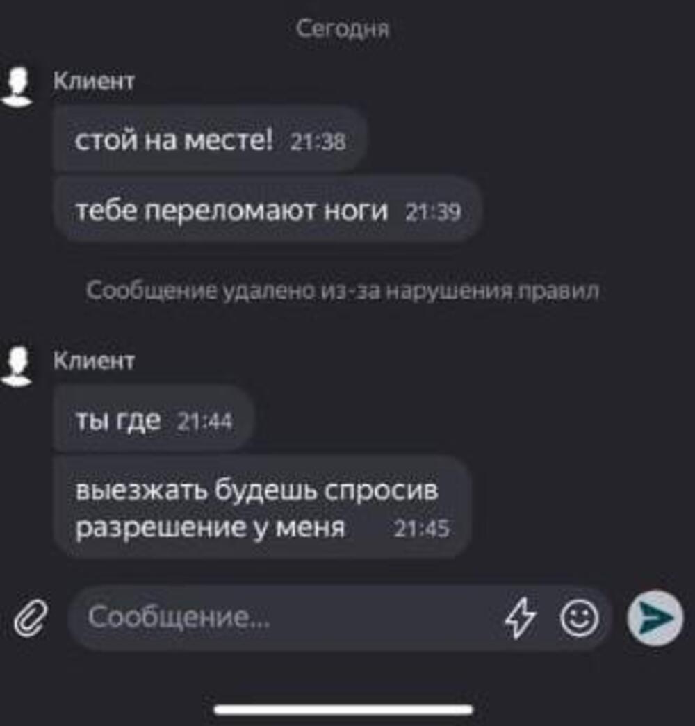 По версии курьера, Александра позвонила ему с угрозами, а затем написала в сообщениях: «Тебе переломают ноги» и «Выезжать будешь, спросив разрешение у меня». В ответ Глеб оформил возврат заказа.