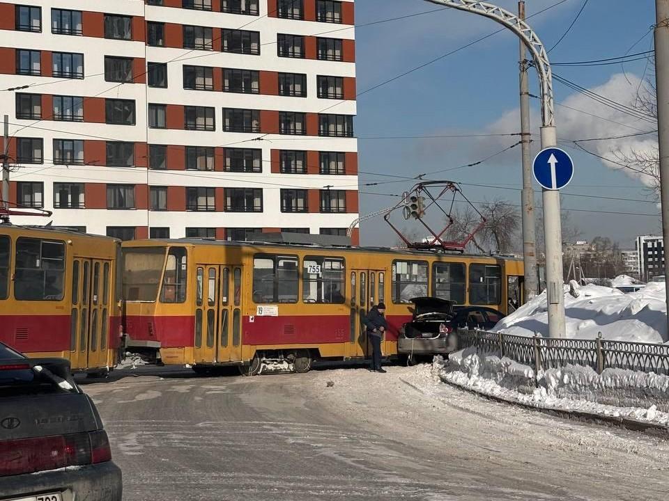 Трамвай прижал легковушку к ограждению в Екатеринбурге