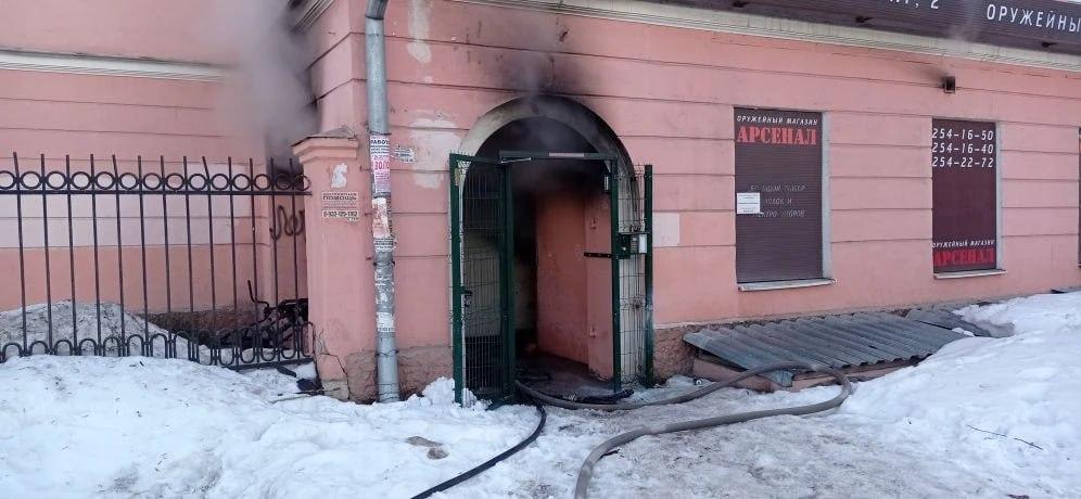 Пожар случился сегодня в четырёхэтажном доме по адресу Сибирский тракт, 2, где располагается оружейный магазин. В ходе ликвидации возгорания был найден труп.