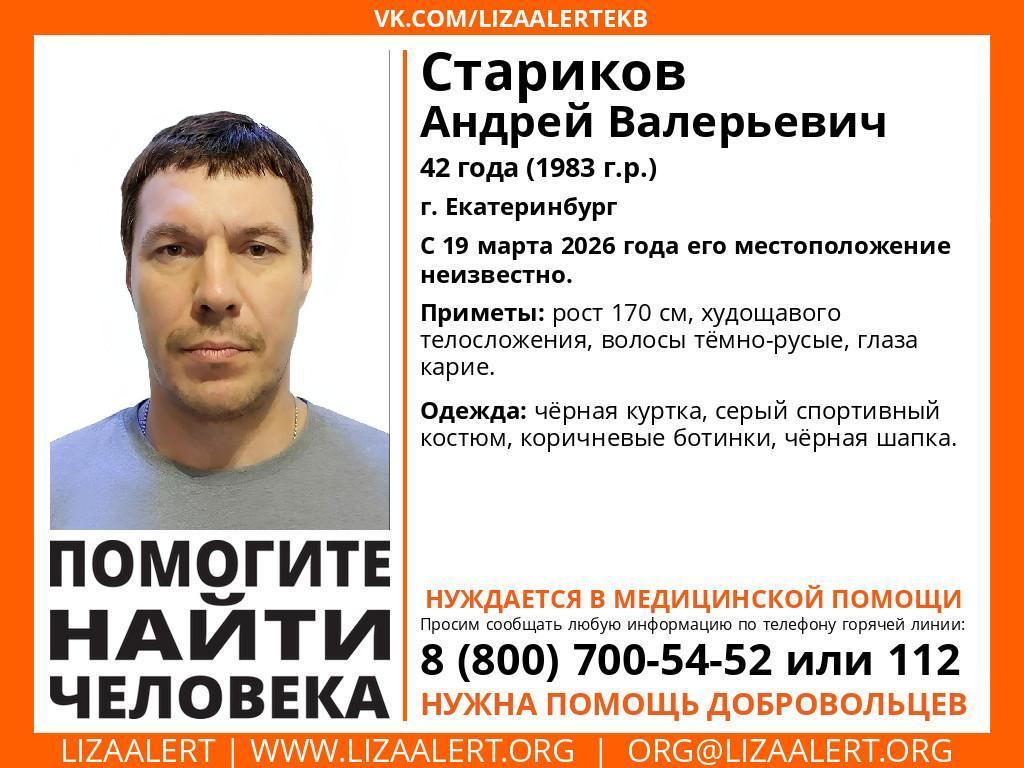 В Екатеринбурге объявлен в розыск 42-летний Андрей Валерьевич Стариков, который бесследно исчез утром в четверг, 19 марта. Мужчина вместе с супругой покинул лечебное учреждение, но до места проживания не доехал.