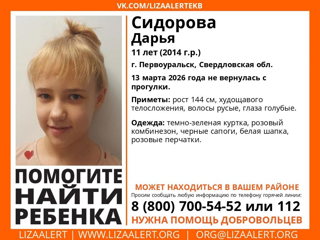 Поисковый отряд «ЛизаАлерт» объявил о пропаже 11-летней Дарьи Сидоровой в Первоуральске. «13 марта 2026 года не вернулась с прогулки», — указано в сообщении волонтёров.