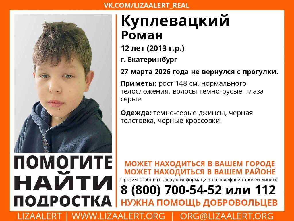 В Екатеринбурге разыскивают 12-летнего Романа Куплевацкого. Подросток ушёл на прогулку и не вернулся домой.
