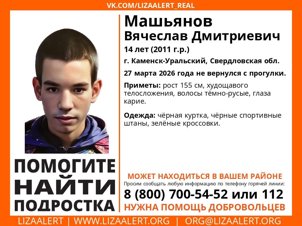 В Каменске-Уральском с той же даты ищут 14-летнего Вячеслава Машьянова. Этот подросток также не пришёл домой после прогулки.
