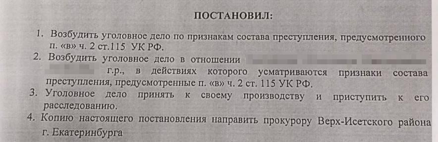 Адвокат Задоркин обратился в следственный отдел СК по Верх-Исетскому району для возбуждения уголовного дела. 2 марта заявление направили в ОП-9 УМВД Екатеринбурга. Силовики возбудили дело по статье 115 УК РФ о причинении легкого вреда здоровью.