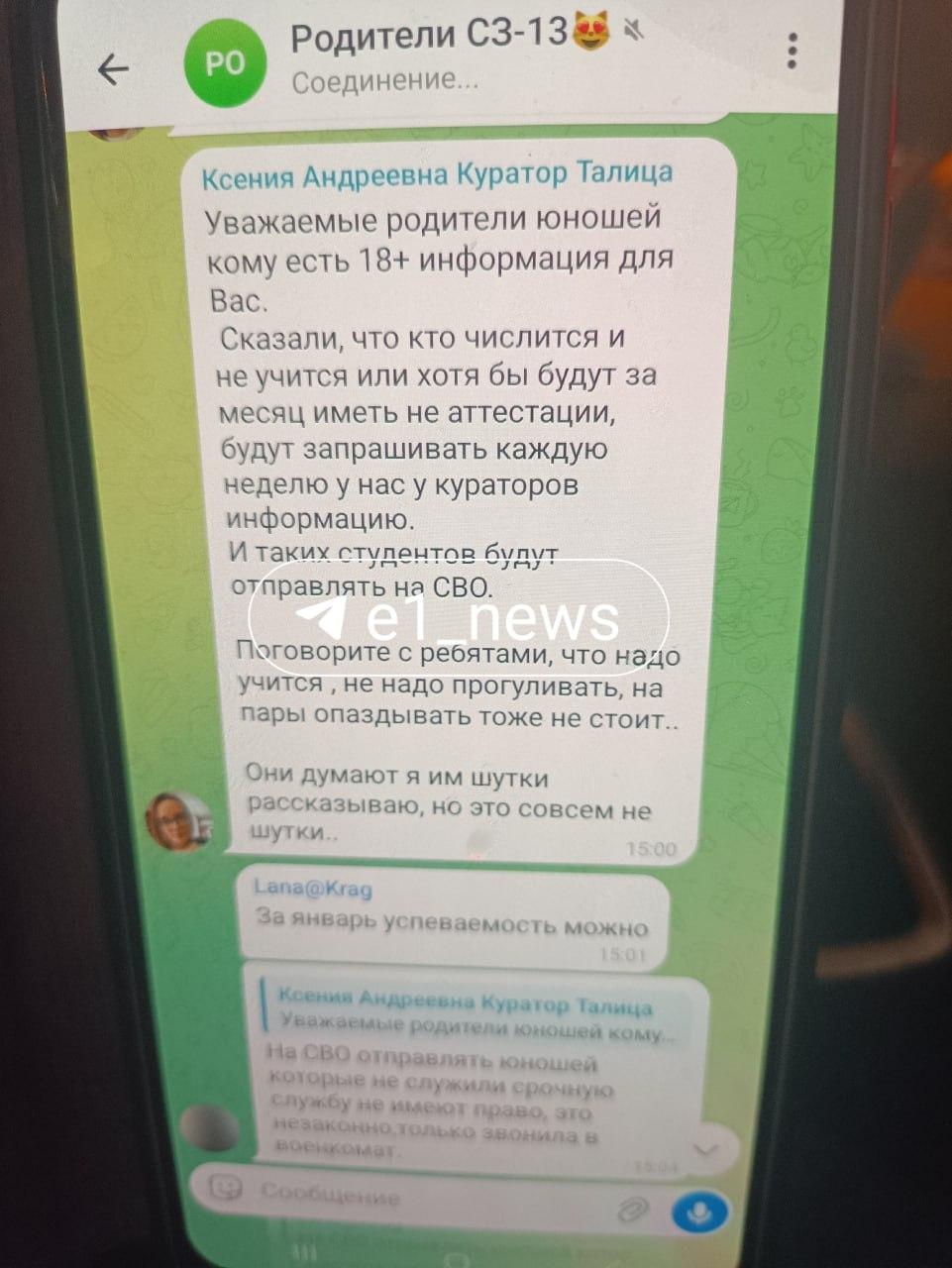 Куратор в лесотехническом колледже Талицы разослала родителям первокурсников тревожное сообщение, связав низкую успеваемость с возможной отправкой на специальную военную операцию. По её словам, данные об отстающих учащихся запрашиваются учебным заведением еженедельно.