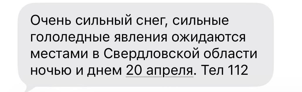 20 апреля спасатели предупредили жителей Свердловской области о приближении сильного снегопада и гололеда. Оповещение поступило через систему РСЧС — единую государственную систему предупреждения и ликвидации чрезвычайных ситуаций.