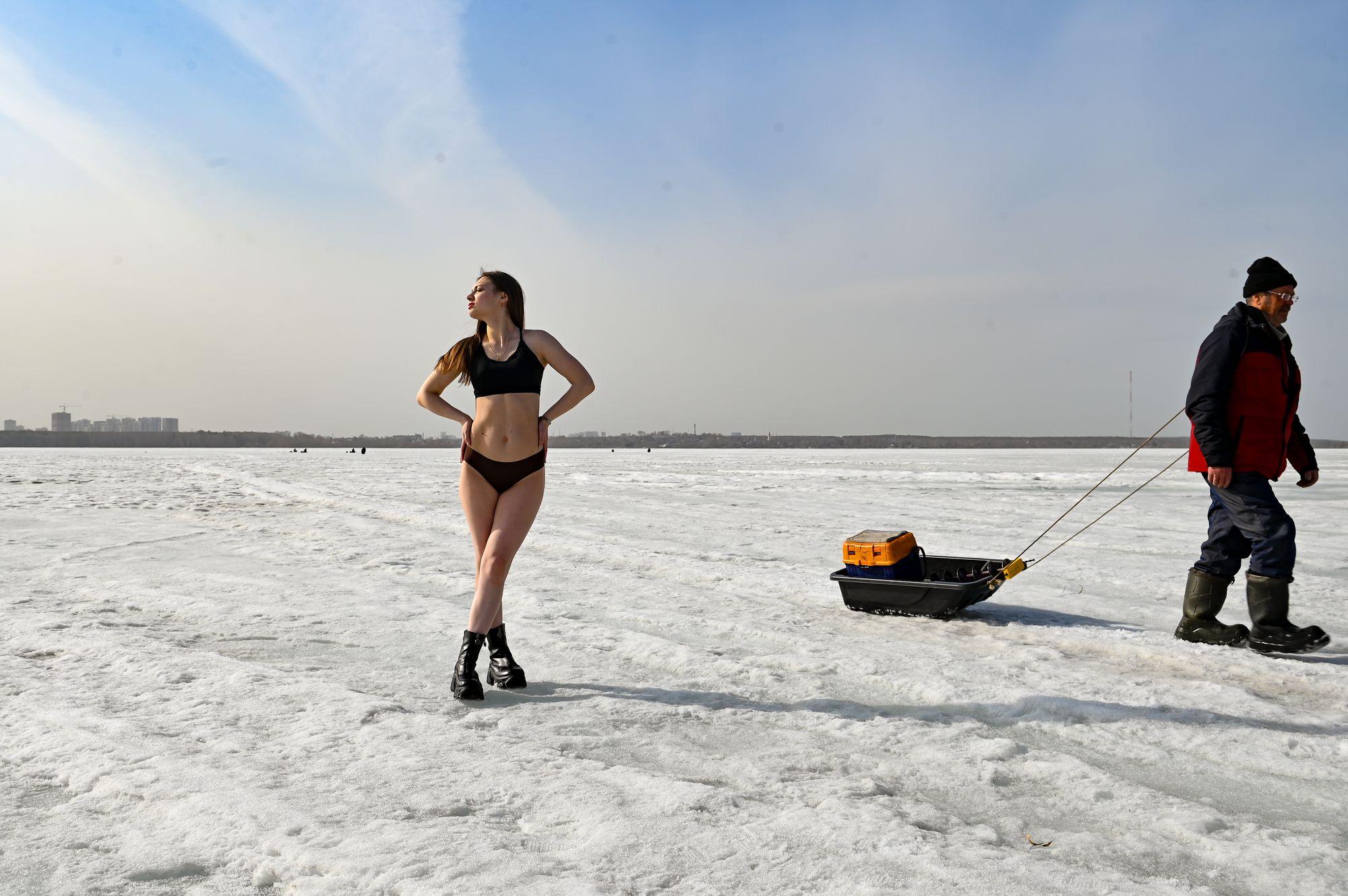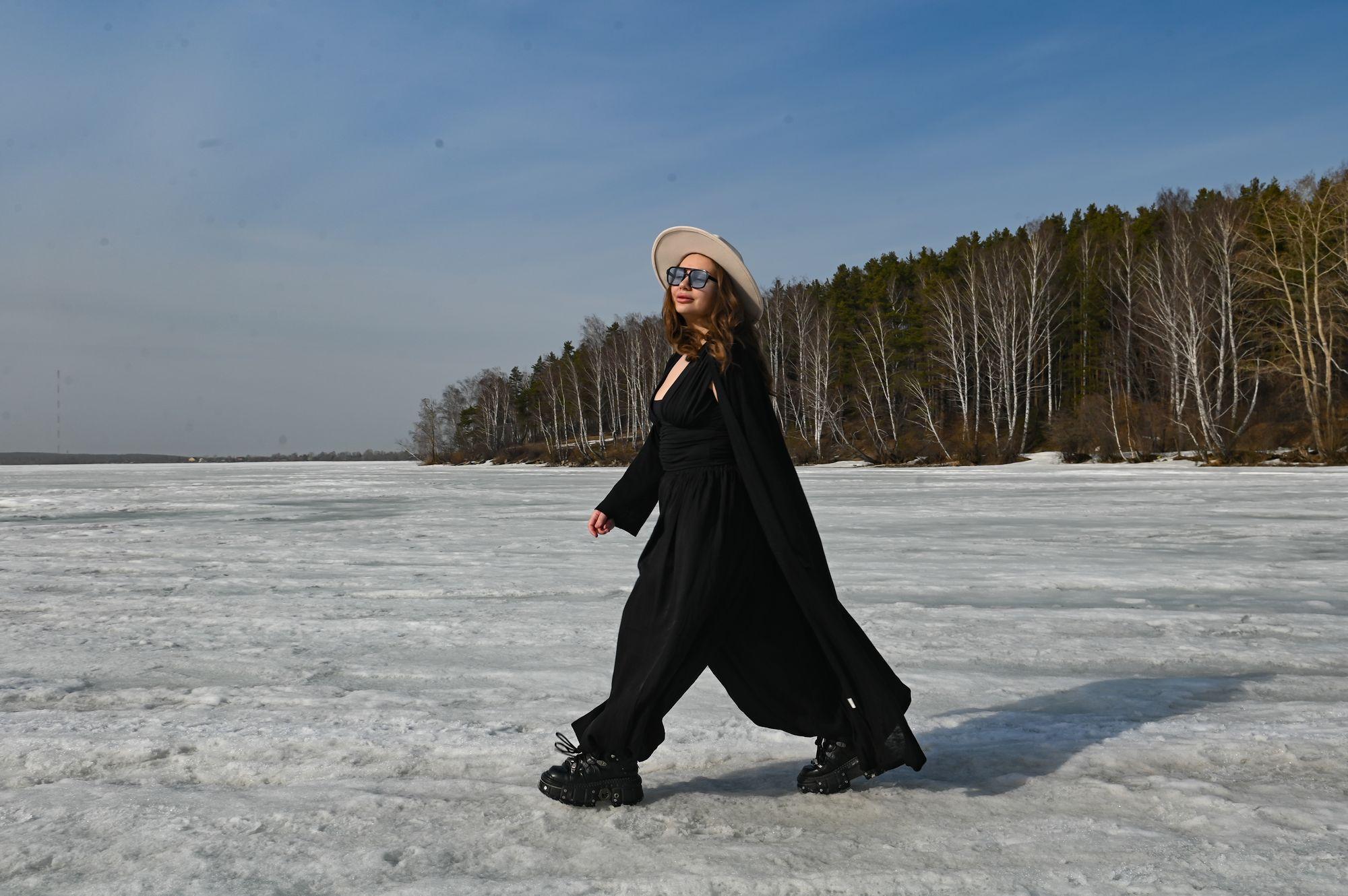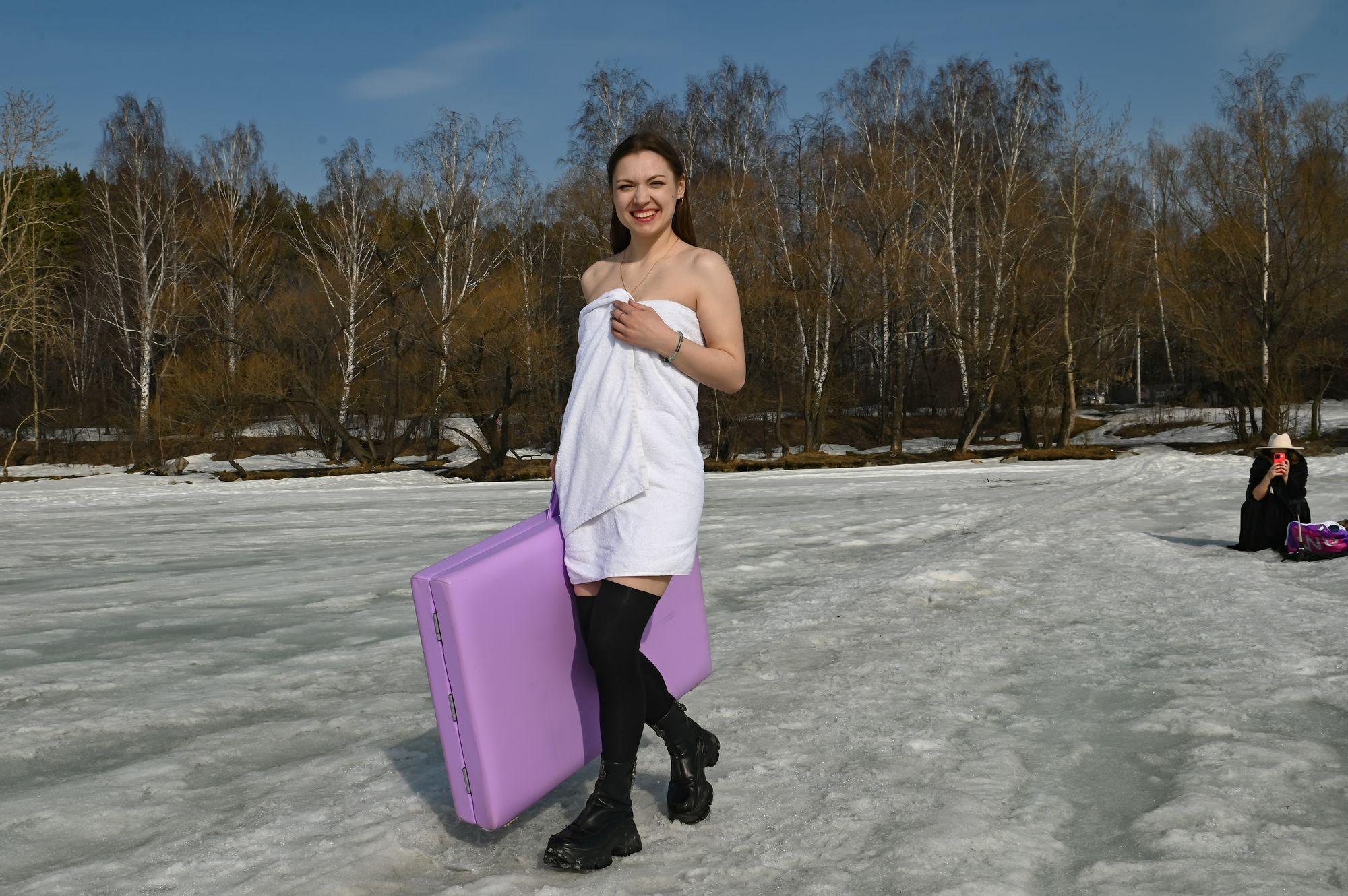 В Екатеринбурге установилась теплая погода с температурой около +20 градусов, что побудило некоторых горожанок символически открыть пляжный сезон. Местом для этого стал берег озера Шарташ, где еще сохраняются снег и лед.