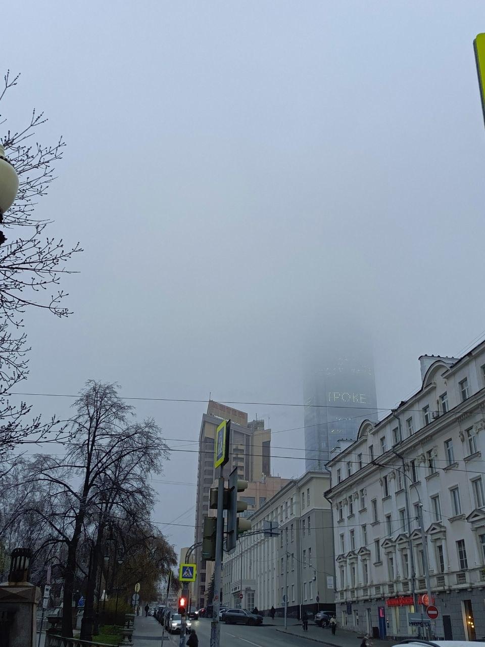 Вечером 21 апреля густой туман, пришедший вслед за ледяным дождем, накрыл Екатеринбург, создав загадочную атмосферу и скрыв из виду верхние этажи зданий.