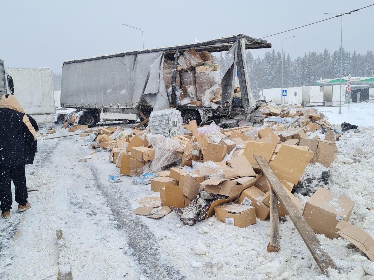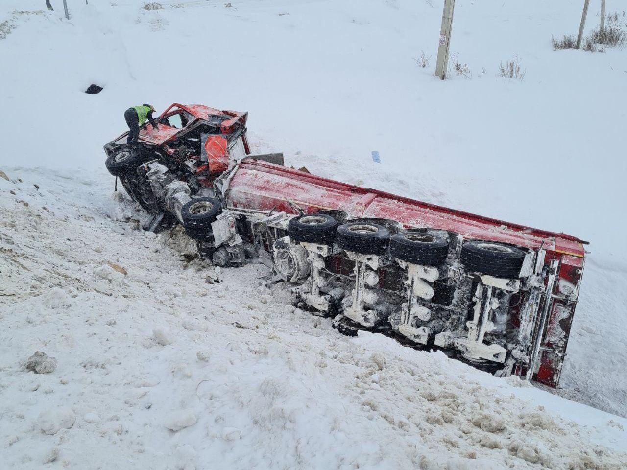 На федеральной трассе М-12 в Нижнесергинском районе Свердловской области произошло серьёзное дорожно-транспортное происшествие. У села Первомайского грузовой автомобиль с прицепом опрокинулся на заснеженном участке, что привело к образованию многокилометровой пробки.