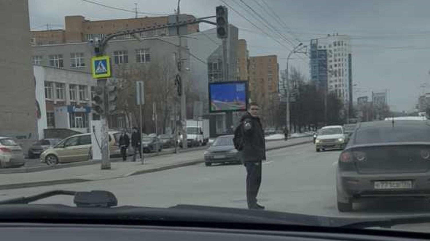 Молодой человек с палкой-указкой взял на себя обязанности инспектора на перекрестке улиц Крауля и Мельникова, где сломался светофор.