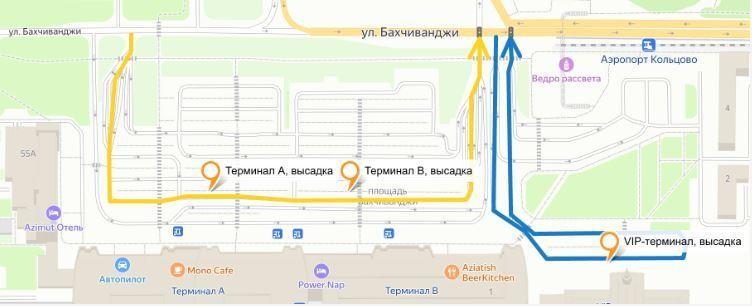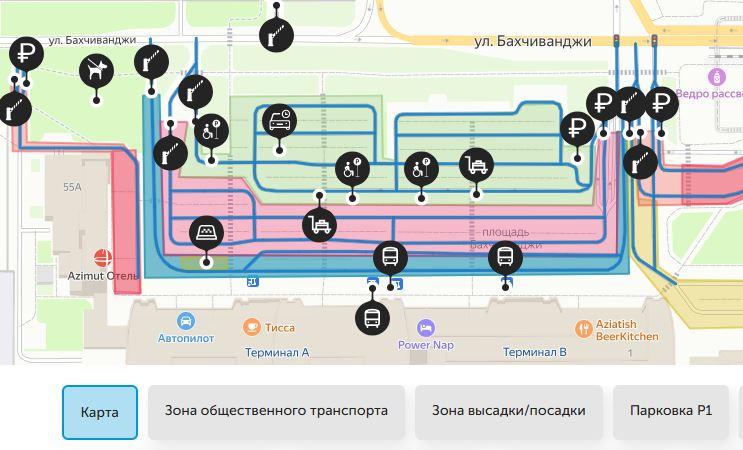 На карте отмечены точки посадки пассажиров на первой линии, ближайшей к терминалам