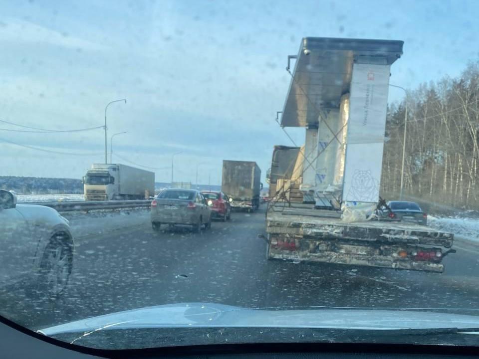 На Пермском тракте ранее образовалась глухая пробка после массового дорожно-транспортного происшествия. До этого на том же участке возникал затор из-за гололеда, когда грузовики не могли преодолеть подъем.
