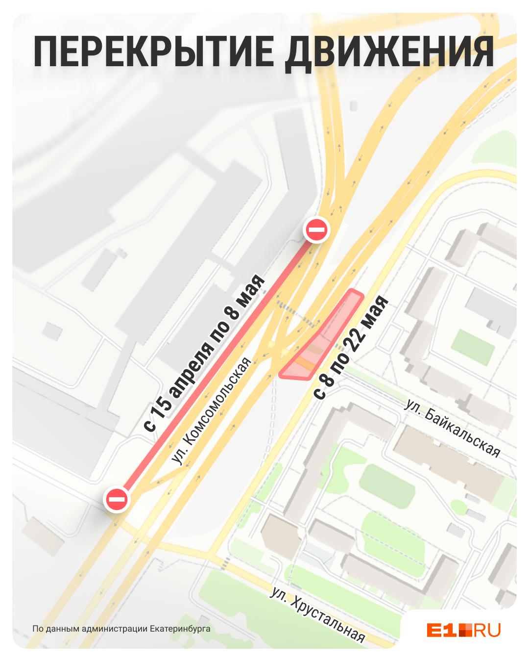 В Екатеринбурге с 15 апреля по 8 мая будет закрыт для проезда участок улицы Комсомльской от дома №80 до Базового переулка. Следом, с 8 по 22 мая, перекроют перекрёсток Комсомльской и Байкальской.