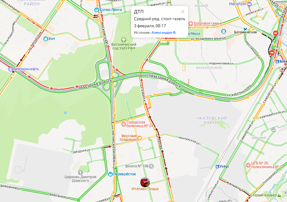 Согласно данным сервиса «Яндекс Карты», текущая дорожная обстановка в Екатеринбурге оценивается в семь баллов. Серьезные затруднения движения также отмечаются в районе развязки у концерна «Калина» и на улице Машиностроителей.