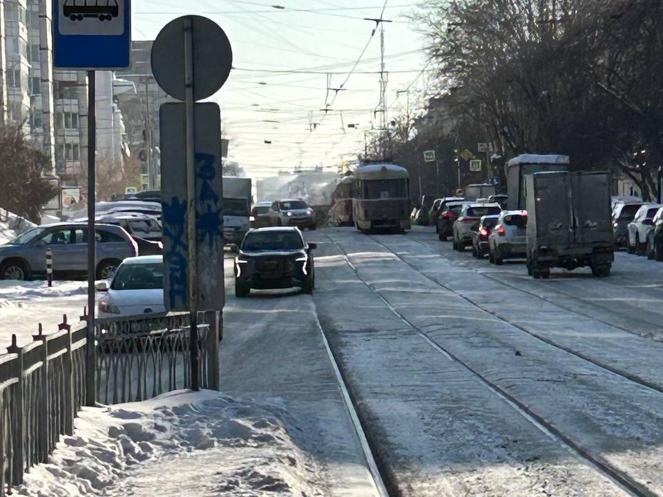 5 февраля на улице Луначарского в центре Екатеринбурга произошла массовая остановка трамваев. Транспорт не двигался более 20 минут.
